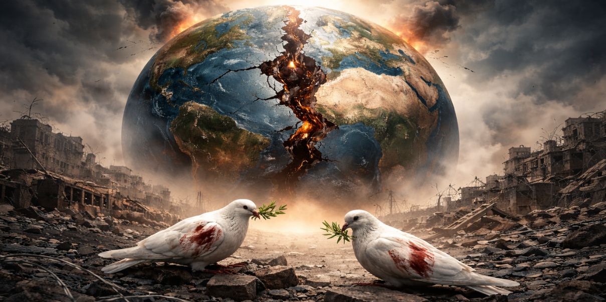 Um planeta ferido pela violência e pela ambição, onde a esperança insiste em sobreviver entre escombros e ruínas, simbolizada pela frágil busca humana pela paz em meio aos conflitos do século XXI Imagem feita a partir da IA