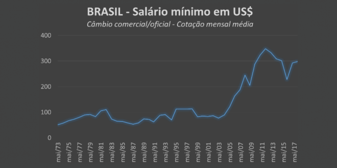 Daí em diante, tanto por conta de fatores econômicos – internos e externos – quanto políticos, o SM passa a perder valor quando nominado na divisa ianque. Tanto o é que, na cotação atual, o Salário Mínimo previsto para entrar em vigor a partir de janeiro de 2019 está avaliado em US$ 263.48 mensais.