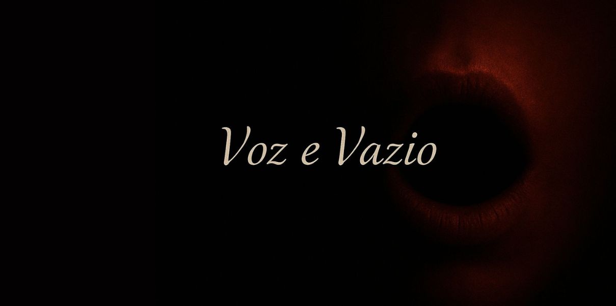 #ParaTodosVerem: Imagem escura com a frase “Voz e Vazio” em letras claras. Ao lado direito, um detalhe da boca de uma pessoa com os lábios entreabertos e uma sombra profunda no lugar da boca, simbolizando o vazio ou o silêncio.