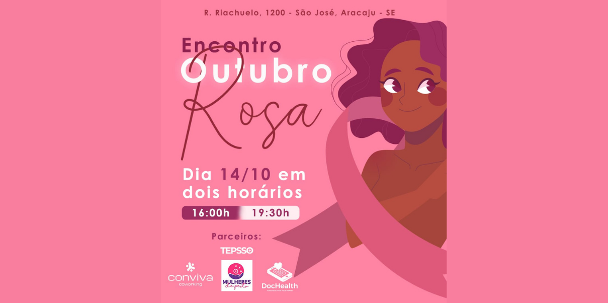 A importância da saúde preventiva é o principal tema de duas sessões – uma às 16 horas e outra às 19h30 – promovidas pelos gestores do aplicativo sergipano DocHealth, em parceria com Tepsso e Conviva Coworking, que sediará o evento. A inscrição tem o valor simbólico de R$ 10,00, que pode ser feita através do Sympla (clique e faça a inscrição para as 16 horas ou para as 19h30). O valor arrecadado com as inscrições será revertido para o Movimento Mulheres de Peito.