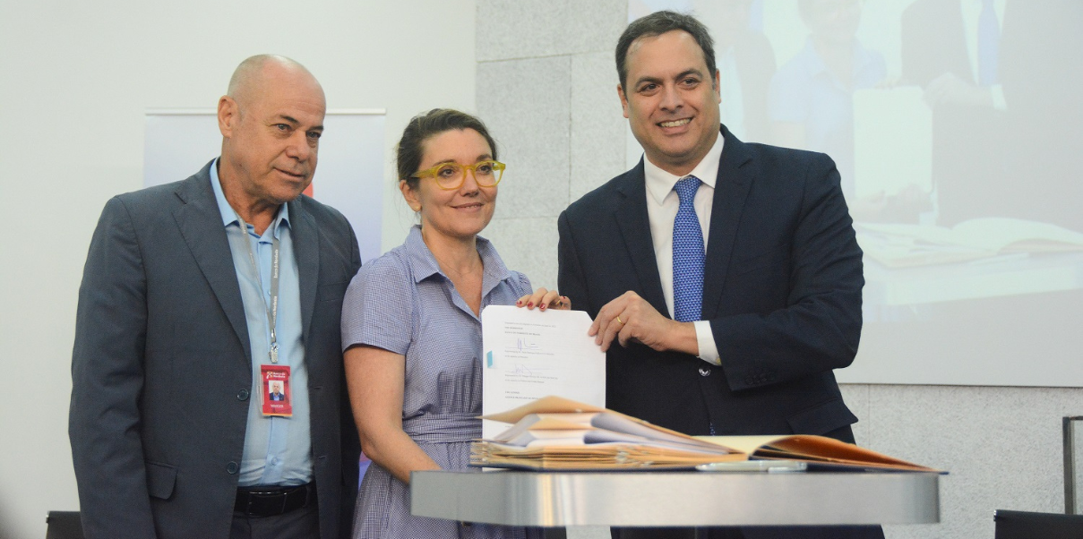 Diretor Financeiro e de Crédito, Wanger Rocha (à esquerda), e presidente Paulo Câmara, assinam convênio com a diretora regional da Agência Francesa de Desenvolvimento (AFD), Laetitia Dufay
