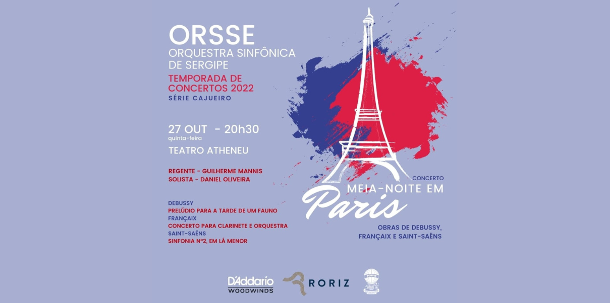 Neste próximo dia 27 de outubro, quinta-feira, no Teatro Atheneu, às 20h30, a Orquestra Sinfônica de Sergipe produzirá um dos pontos altos de sua Temporada 2022 de Concertos. A orquestra executará o concerto “Meia-noite em Paris”, inteiramente dedicado ao repertório francês, com destaque para a presença do solista Daniel Oliveira, clarinetista, para a apresentação do Concerto para Clarinete e Orquestra de Jean Françaix (1912-1997). Completam o programa a Sinfonia nº2, do compositor romântico Camille Saint-Saëns (1835-1921) e o Prelúdio para a tarde de um Fauno, do impressionista Claude Debussy (1862-1918). A regência será do maestro Guilherme Mannis, titular da Orsse.