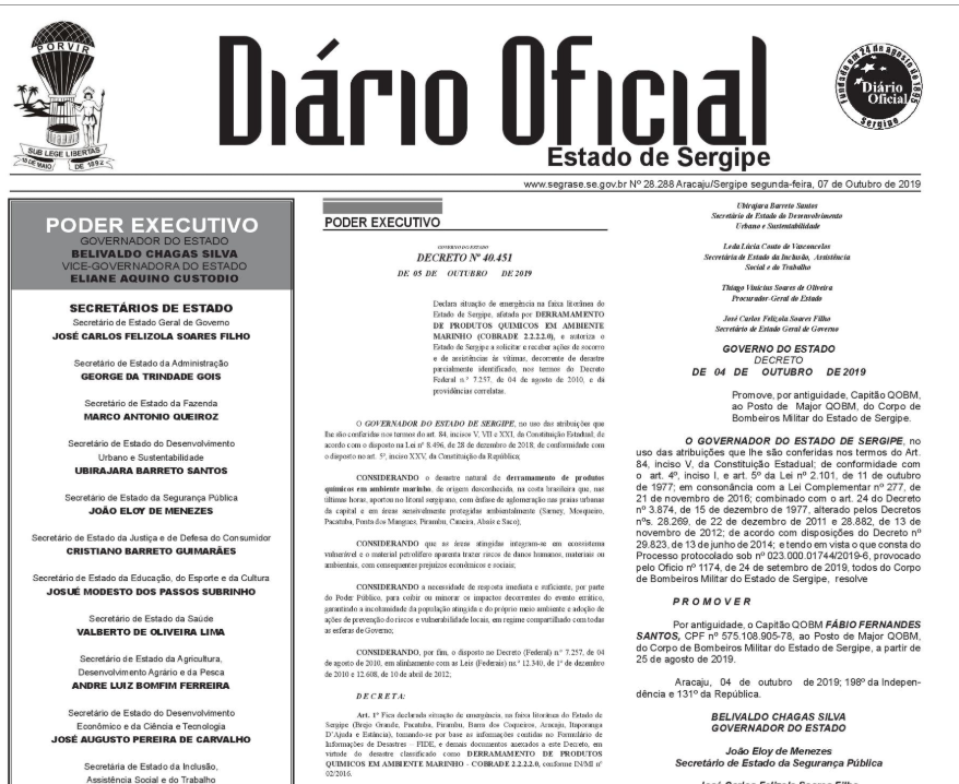 O Governo de Sergipe decretou situação de emergência na faixa litorânea “afetada pelo derramamento de produto químico em ambiente marinho”. O decreto tem data do sábado, 5, mas hoje é que foi publicado no Diário Oficial do Estado. Esse decreto “autoriza o Estado a solicitar e receber ações de socorro e de assistência às vítimas, decorrente de desastre parcialmente identificado”.