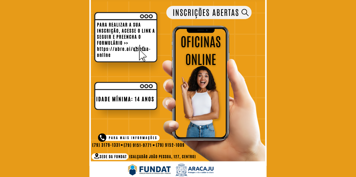 A partir desta quinta-feira, 3, a Fundação Municipal de Formação para o Trabalho (Fundat), da Prefeitura de Aracaju, está com inscrições abertas para o preenchimento de 1.000 vagas em 10 oficinas online destinadas à qualificação profissional do cidadão que deseja ingressar no mercado de trabalho.