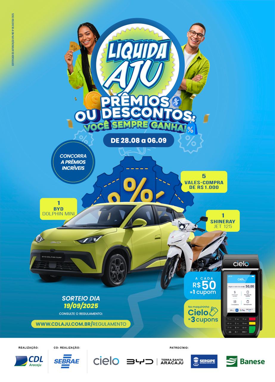 De 28 de agosto a 6 de setembro, a Câmara de Dirigentes Lojistas de Aracaju (CDL Aracaju) realiza mais uma edição do LiquidaAju, campanha consolidada como uma das mais importantes iniciativas de incentivo ao varejo sergipano. O evento tem como propósito impulsionar as vendas, estimular o consumo consciente e fortalecer a economia local.