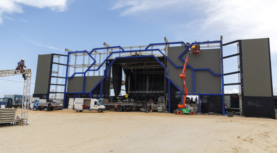 Ele também detalhou os cuidados adotados para garantir a segurança dos trabalhadores envolvidos na operação. “São cerca de 200 pessoas envolvidas direta e indiretamente na montagem da estrutura. O palco deste ano está maior, com 52 metros de ponta a ponta. É o maior palco que já tivemos em nossos projetos. Todo o trabalho é acompanhado por técnico de Segurança do Trabalho, com orientação constante sobre o uso de EPIs [equipamentos de proteção individual], garantindo que todos atuem de forma segura e que nenhum incidente aconteça”, destacou.