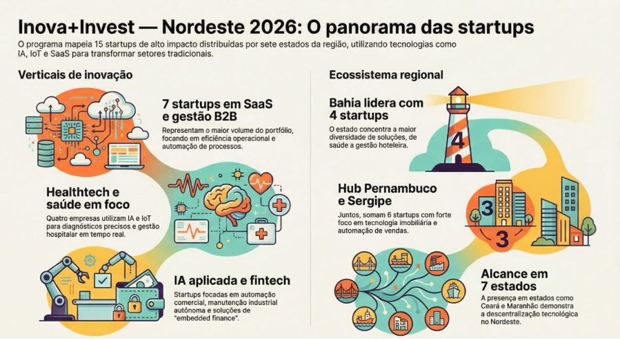 Healthtech, SaaS/B2B Gestão, IA Aplicada e Fintech/Martech concentram as soluções de 15 startups nordestinas selecionadas para a primeira edição regional do Inova+Invest, programa estruturado pela Associação Brasileira de Private Equity e Venture Capital (ABVCAP) em parceria com a Agência Brasileira de Promoção de Exportações e Investimentos (ApexBrasil) e executado pela ACE Ventures. As empresas foram escolhidas entre 68 inscritas no período de janeiro a fevereiro de 2026, das quais 30 passaram pela banca avaliadora e 15 foram aprovadas como finalistas.