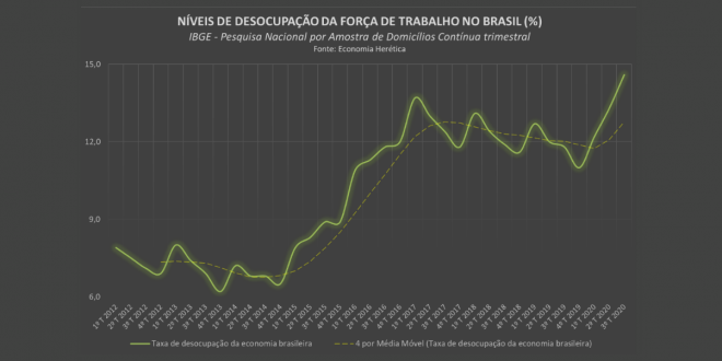 De acordo com a Pesquisa Nacional por Amostragem Domiciliar (PNAD), patrocinada pelo Instituto Brasileiro de Geografia e Estatística (IBGE), a taxa de desocupação da economia nacional foi de 14,6% da força de trabalho, no 3° trimestre de 2020.