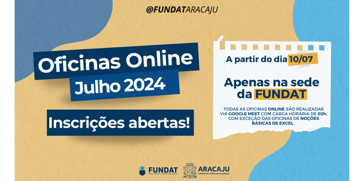 A Prefeitura de Aracaju, por meio da Fundação Municipal de Formação para o Trabalho (Fundat), inicia na quarta-feira da próxima semana, dia 10, as inscrições presenciais para 1.300 vagas em oficinas online do mês de julho. As aulas serão iniciadas no dia 16 de julho e os interessados podem se inscrever enquanto durarem as vagas.